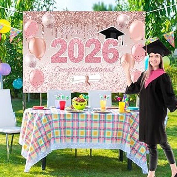 Place it behind the dessert table or use it as a dedicated photo area. Add a “Class of 2026” sign (or your graduate’s year) in gold lettering to elevate the look.