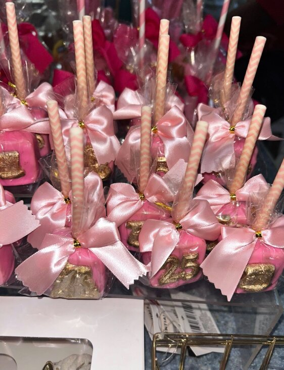 Send guests home with something small but meaningful. Ideas include mini pink candles, personalized lip gloss, pink notebooks or small jars of strawberry jam with custom labels.