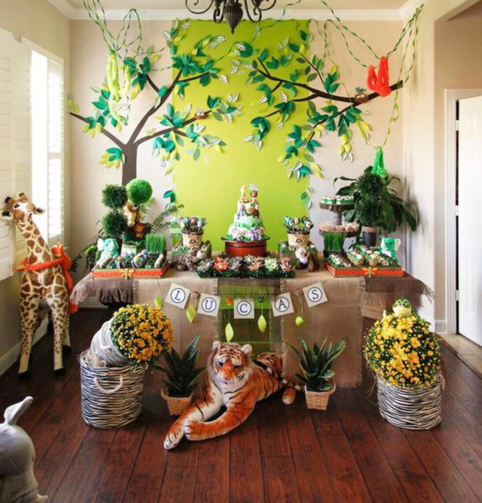 Add animal-print cupcake wrappers, jungle-themed cookies, and a cake topped with cute baby animals.