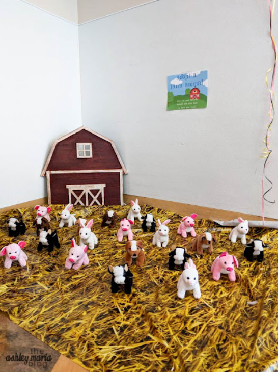 Set up a small table with plush farm animals like cows, pigs and sheep. Each child can pick one to adopt and give it a name.