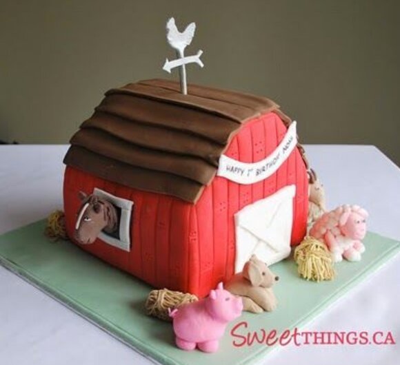 You can decorate a rectangular cake with bright red frosting and white trim so it resembles a barn. Adding small toy animals around the base creates a cute farm scene.