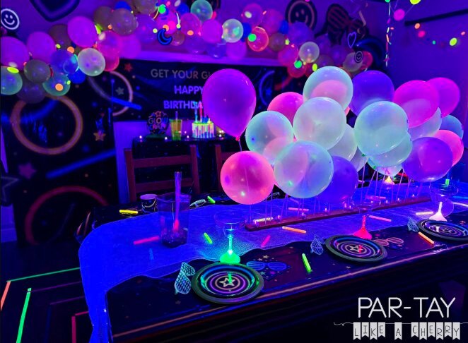 Turn down the lights and turn up the music for a glow party. Use glow sticks LED balloons and neon decorations to transform your space.