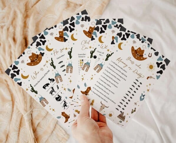 Give classic shower games a western twist. Try “Pin The Badge On The Sheriff,” cowboy-themed baby bingo, or a diaper-changing race.