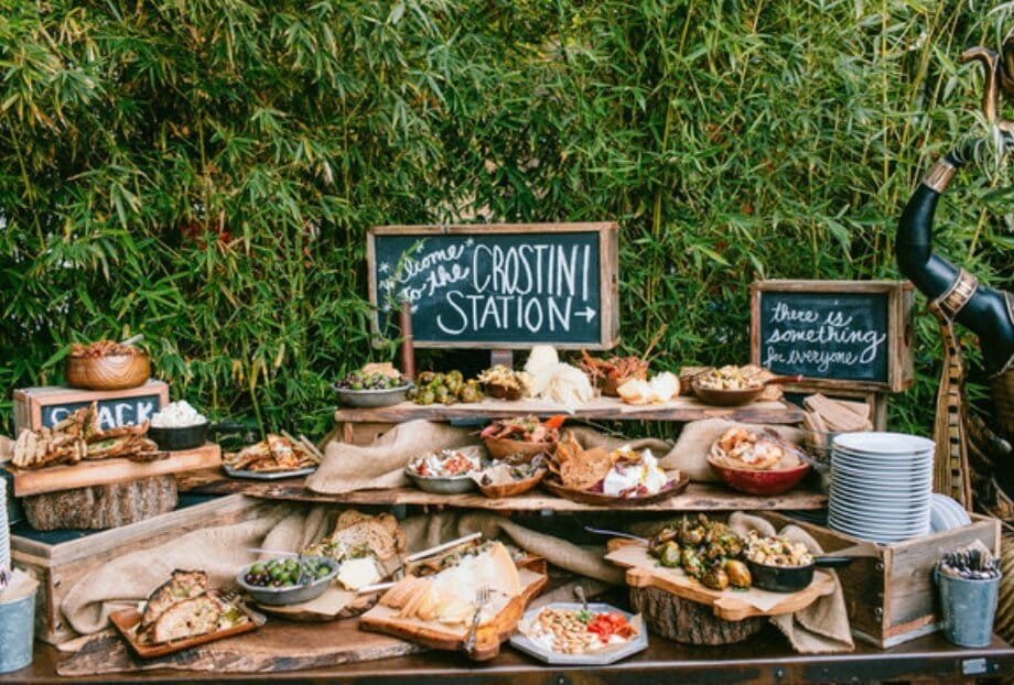 Skip formal dining and create a relaxed chuckwagon-style food bar. BBQ sliders, mac and cheese cups, cornbread muffins, and mini pies fit the theme perfectly.