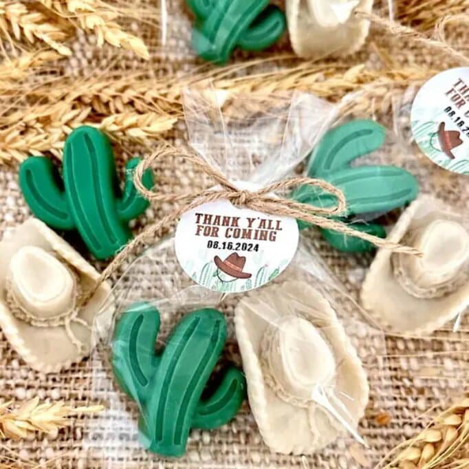 Send guests home with small but meaningful favors. Mini jars of honey labeled “Sweet As Can Bee,” caramel popcorn tagged “Thanks For Riding By,” or small succulents wrapped in burlap are easy options.