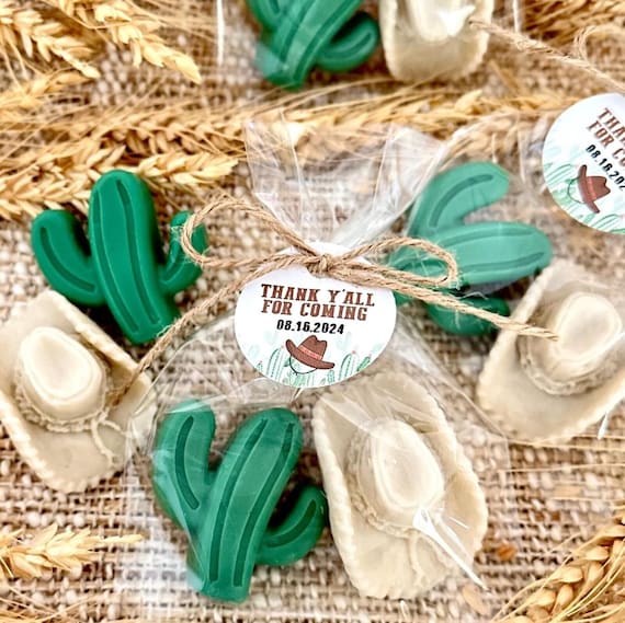 Send guests home with small but meaningful favors. Mini jars of honey labeled “Sweet As Can Bee,” caramel popcorn tagged “Thanks For Riding By,” or small succulents wrapped in burlap are easy options.