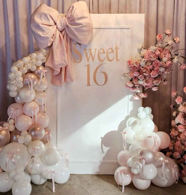 Giant pink “Sweet 16” balloons create a striking centerpiece. The floor covered in white balloons makes the space feel like a cloud.