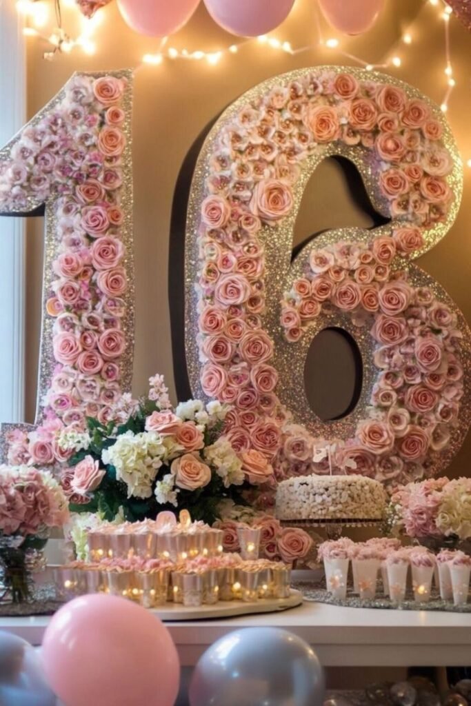 This gorgeous dessert table with its huge floral numbers is a centerpiece. It’s a truly glamorous idea for 16 birthday party ideas, creating a dazzling focal point.