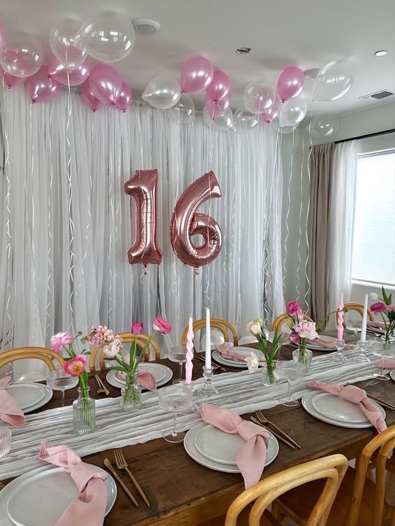 This beautifully set table is a refined and sophisticated idea for 16 birthday party ideas. The soft colors and delicate flowers create a calm, chic atmosphere.