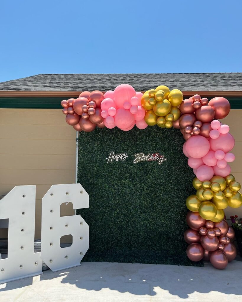 This lush green hedge wall with a “Happy Birthday” neon sign is a fresh take on 16 birthday party ideas. The pink and gold balloon garland adds a festive, joyful touch.
