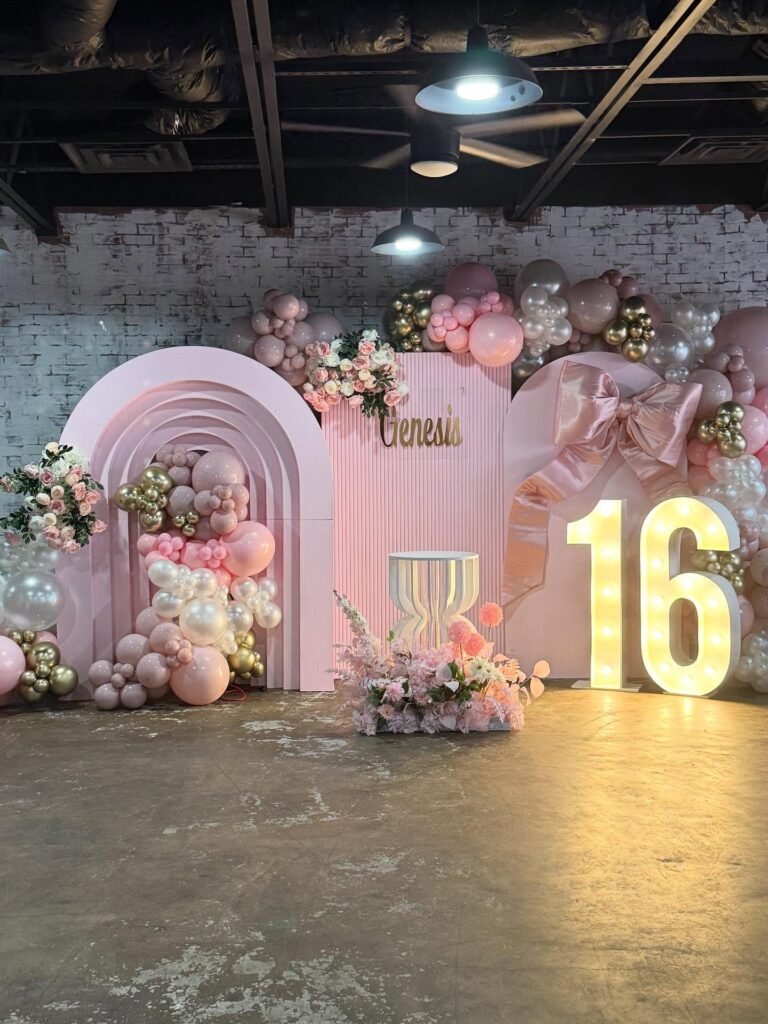 The soft pink tones, coupled with gleaming gold accents, create a sophisticated yet playful atmosphere. Large illuminated “16” numbers add a dazzling focal point, perfect for countless photo opportunities with friends and family.