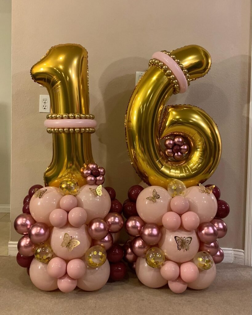 These stunning golden balloon sculptures are a regal addition to any birthday party. They are a standout among creative 16 birthday party ideas, making a grand statement.