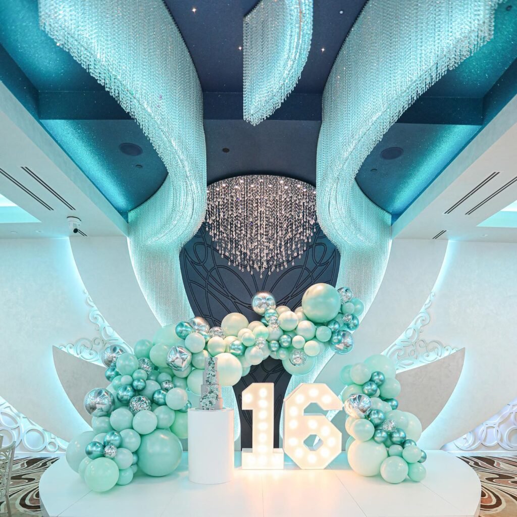 This stunning mint and silver balloon arch creates a magnificent stage for a milestone event. It is a fantastic choice among elegant 16 birthday party ideas. The cool color palette, paired with the large, lit-up numbers, gives the whole space a feeling of grandeur and celebration.