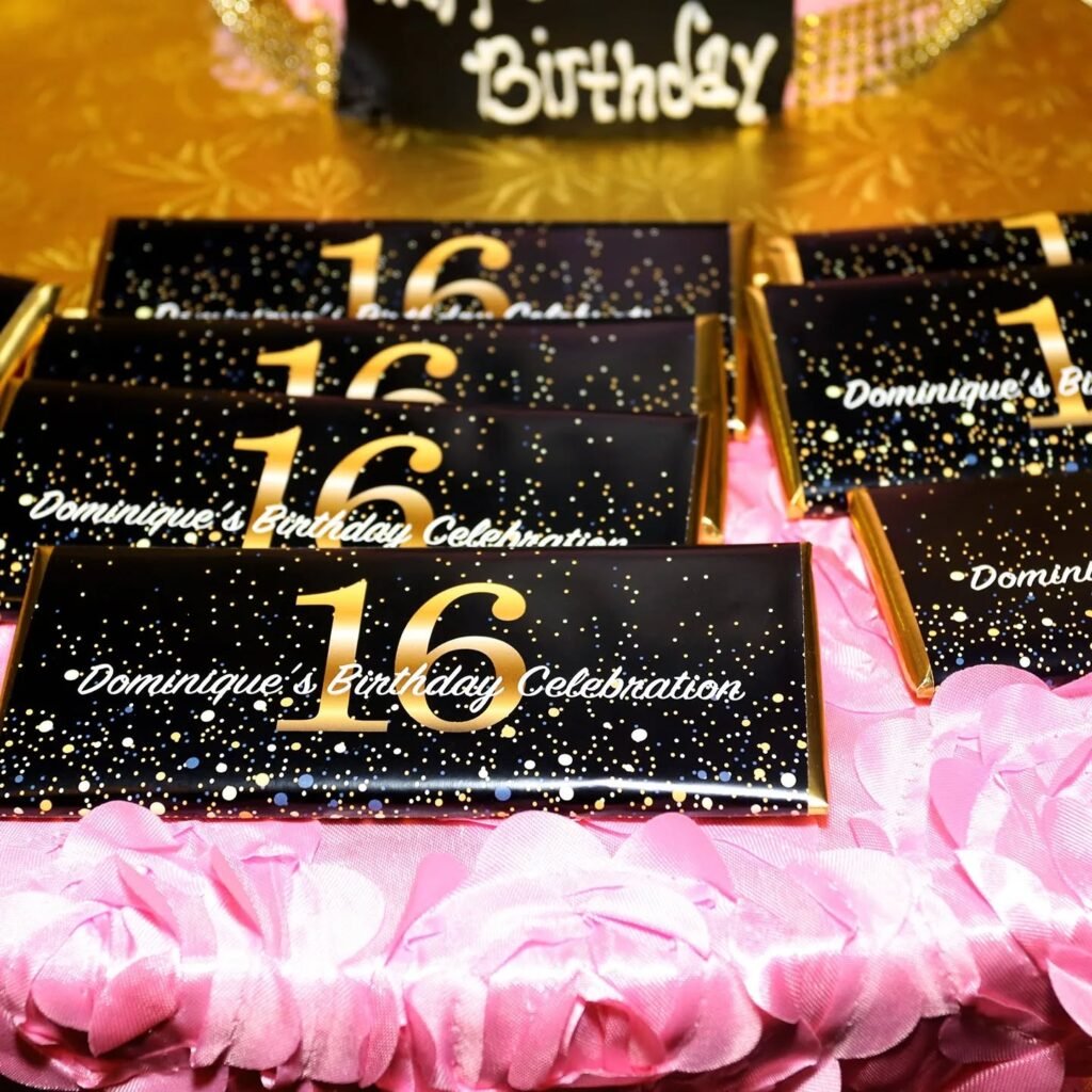 These custom chocolate bars are a thoughtful and fun gift for guests. They are a unique and delicious addition to any list of 16 birthday party ideas.
