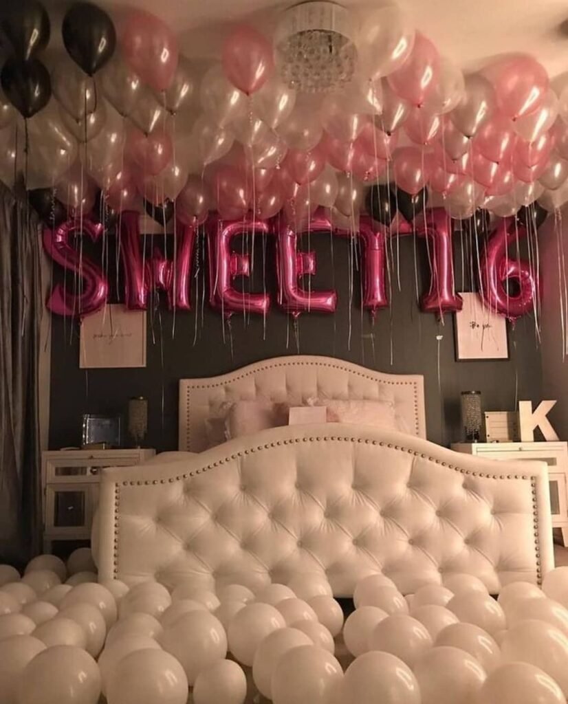 Transform a bedroom into a magical scene with this enchanting balloon setup. It’s a truly personal and joyful choice among 16 birthday party ideas.