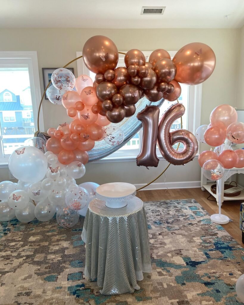This rose gold and white balloon arch with delicate butterflies presents a whimsical option for 16 birthday party ideas. The circular frame makes an inviting, elegant statement.