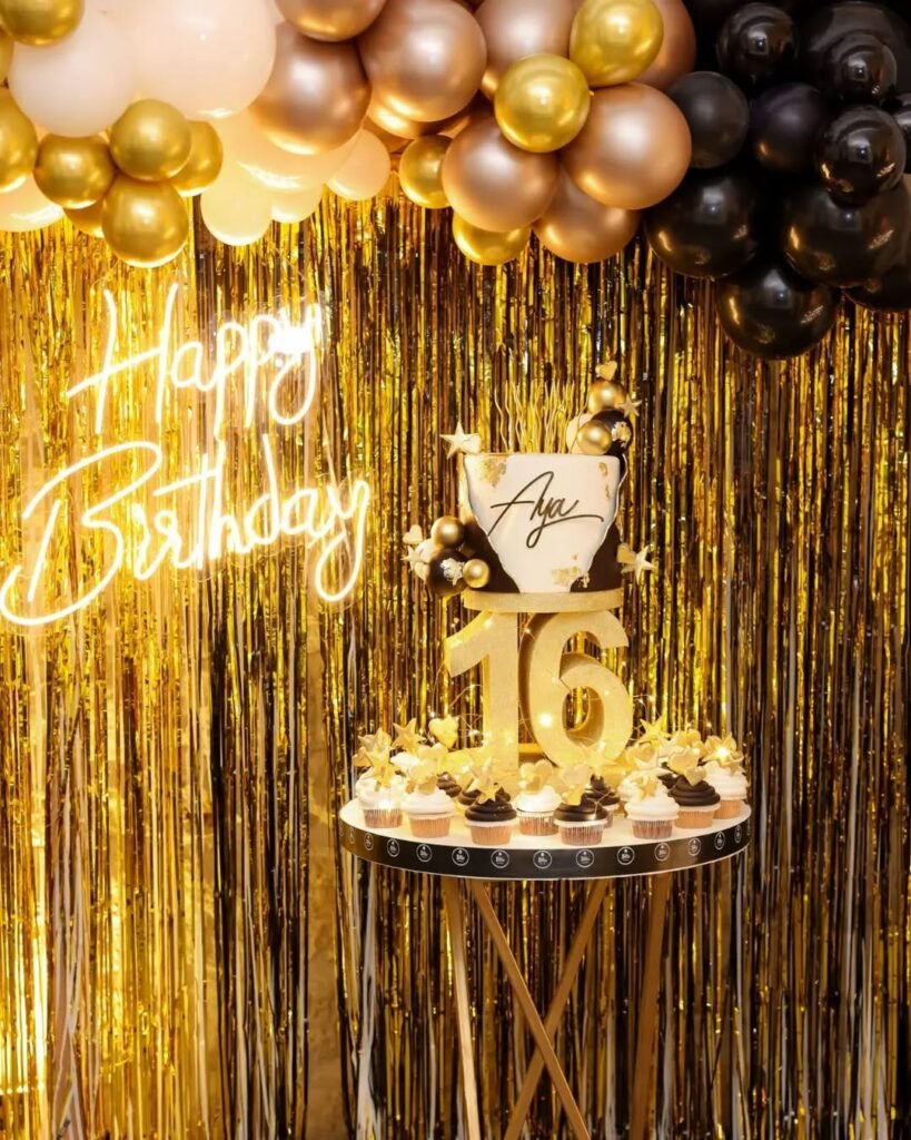 This black and gold party setup radiates pure glamour, making it a spectacular choice for 16 birthday party ideas. The shimmering backdrop creates a stunning, celebratory vibe.
