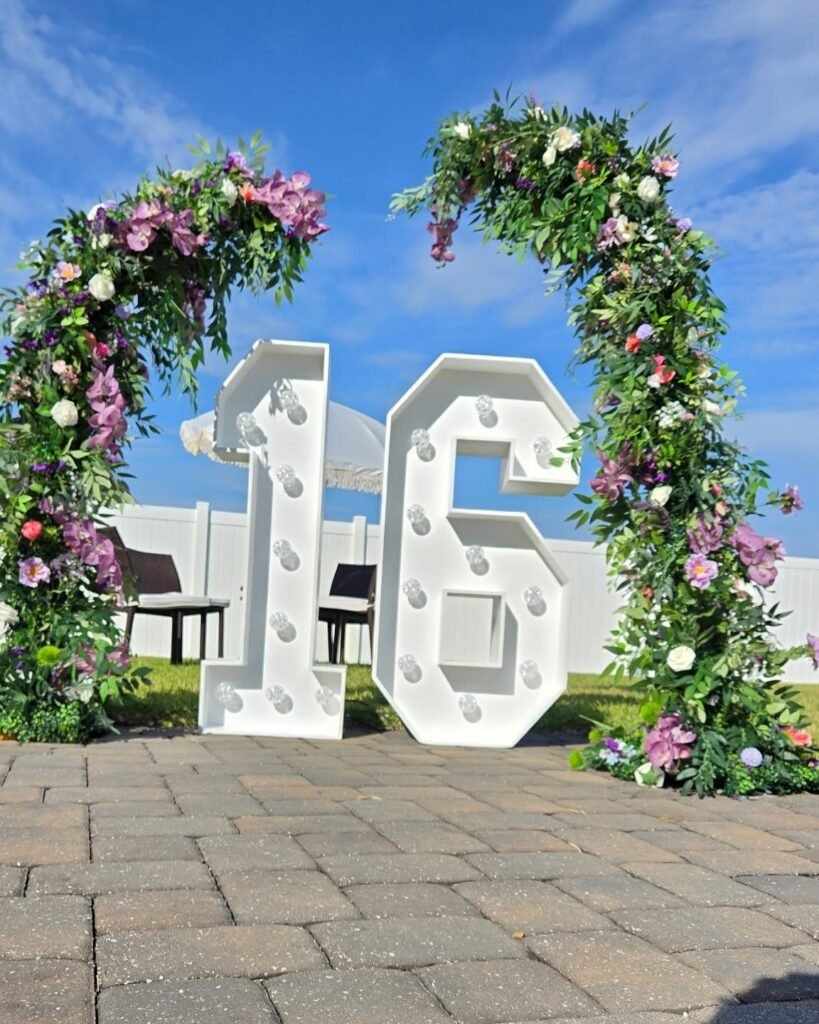 These dazzling light-up numbers surrounded by floral arches are a great centerpiece. They offer a natural and elegant idea for 16 birthday party ideas.
