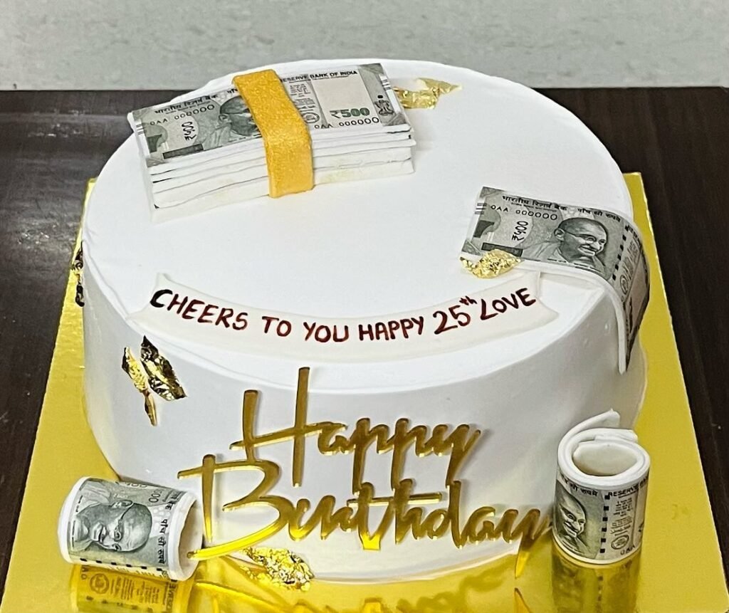 Edible currency notes are cleverly placed around the cake, creating a luxurious feel. The gold leaf accents and bold “Happy Birthday” script add to the opulence. It’s a fun and symbolic creation.