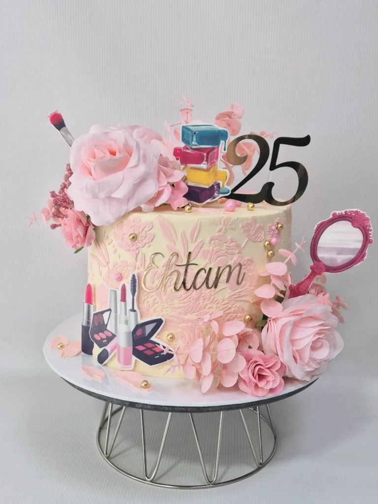 Beautifully crafted makeup tools and delicate gold accents adorn the cake’s sides. The number 25 topper stands out as a bold statement of the special day. It truly celebrates a love for all things beauty.