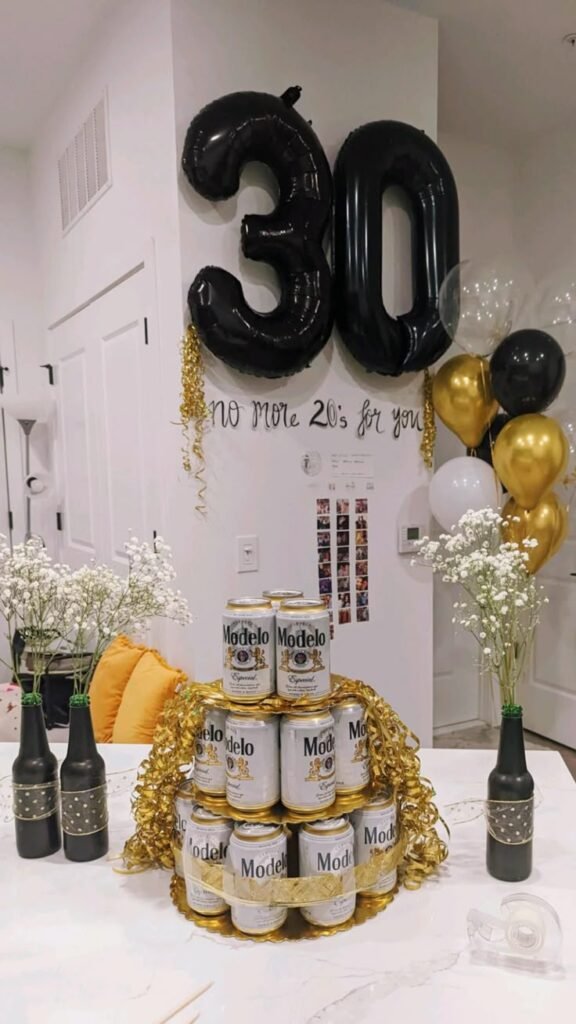 The beer cans are artfully arranged and adorned with festive gold tinsel, adding a celebratory shimmer. Large black “30” balloons float overhead, proudly declaring the milestone. The setup is complemented by elegant black, gold, and white balloons, along with delicate baby’s breath in dark bottles.