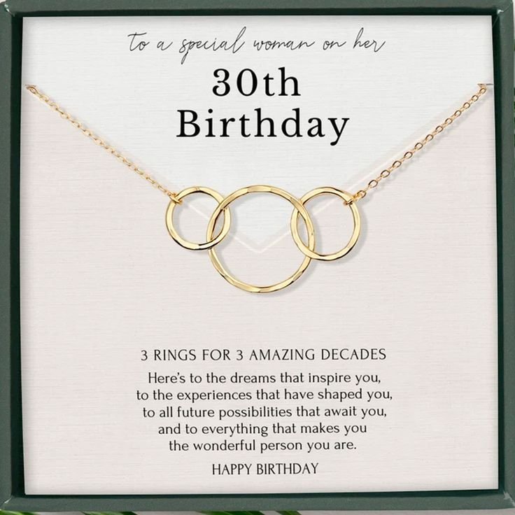 Celebrate her 30th birthday with a truly meaningful and elegant necklace, symbolizing three amazing decades. This beautiful gold-toned piece features three interlocking rings, each representing a past decade, dreams, and future possibilities. It is a thoughtful and enduring 30th birthday gift idea.
