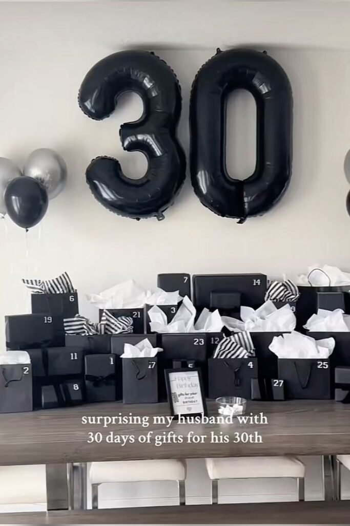 Imagine surprising your husband or boyfriend with a full month of gifts to celebrate his 30th birthday! This impressive setup features thirty individually wrapped presents, each designed to be opened on a specific day leading up to or following his big day.