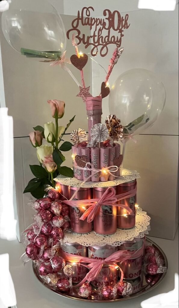 Celebrate a 30th birthday with a dazzling and unique tiered “cake” made of canned beverages, adorned with pink and gold accents. It is a truly celebratory and visually appealing 30th birthday gift idea.