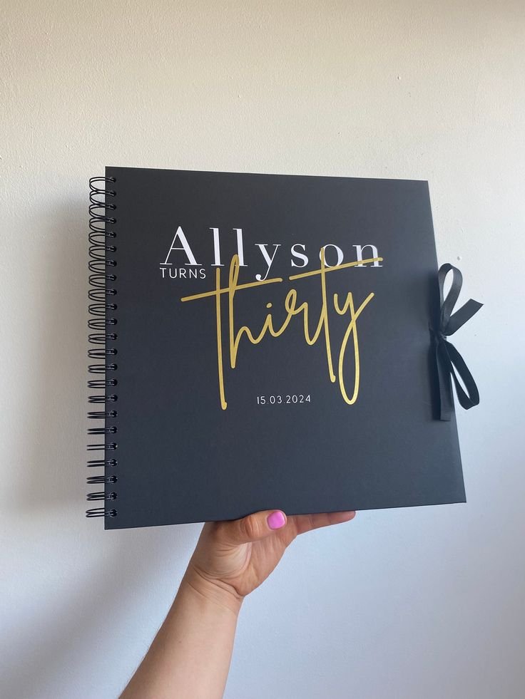 Commemorate a significant 30th birthday with a personalized memory book, a wonderful keepsake for years to come. This elegant black guestbook features “Allyson Turns thirty” in stylish gold and white script, along with the date “15 03 2024”. This makes for a thoughtful 30th birthday gift idea.
