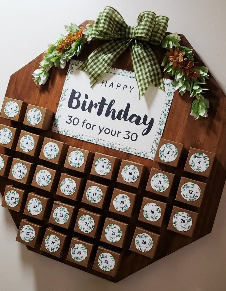 Celebrate a 30th birthday with a beautifully crafted countdown calendar, a truly unique and engaging gift. This rustic wooden board features a “Happy Birthday, 30 for your 30” sign, adorned with a festive gingham bow and green foliage. This is a wonderfully creative way to present 30th birthday gift ideas.