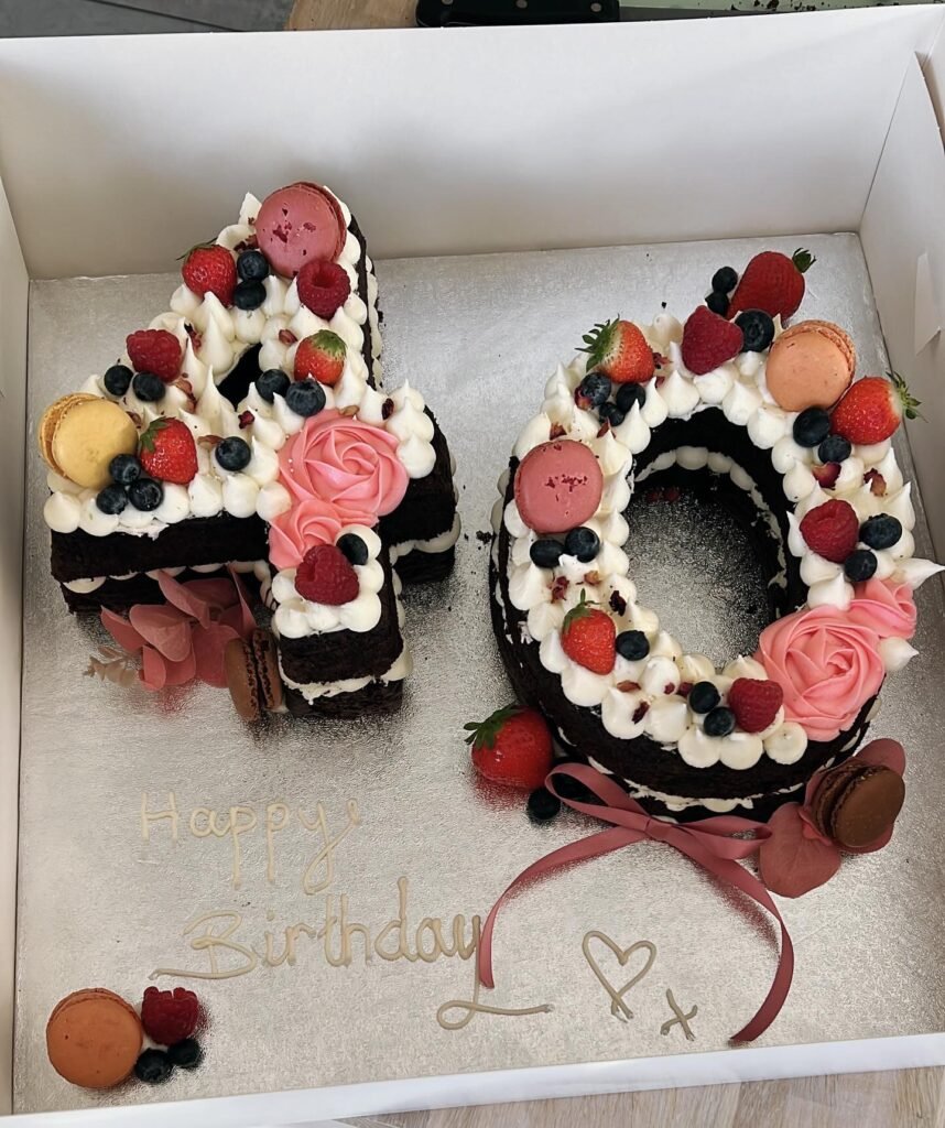 This creative number cake transforms “40” into edible art using rich chocolate cake layers and pristine white frosting. Fresh berries in vibrant reds and blues create natural color and delicious flavor, while pink buttercream roses add elegant touches. Colorful macarons scattered throughout bring Parisian bakery vibes to the celebration.