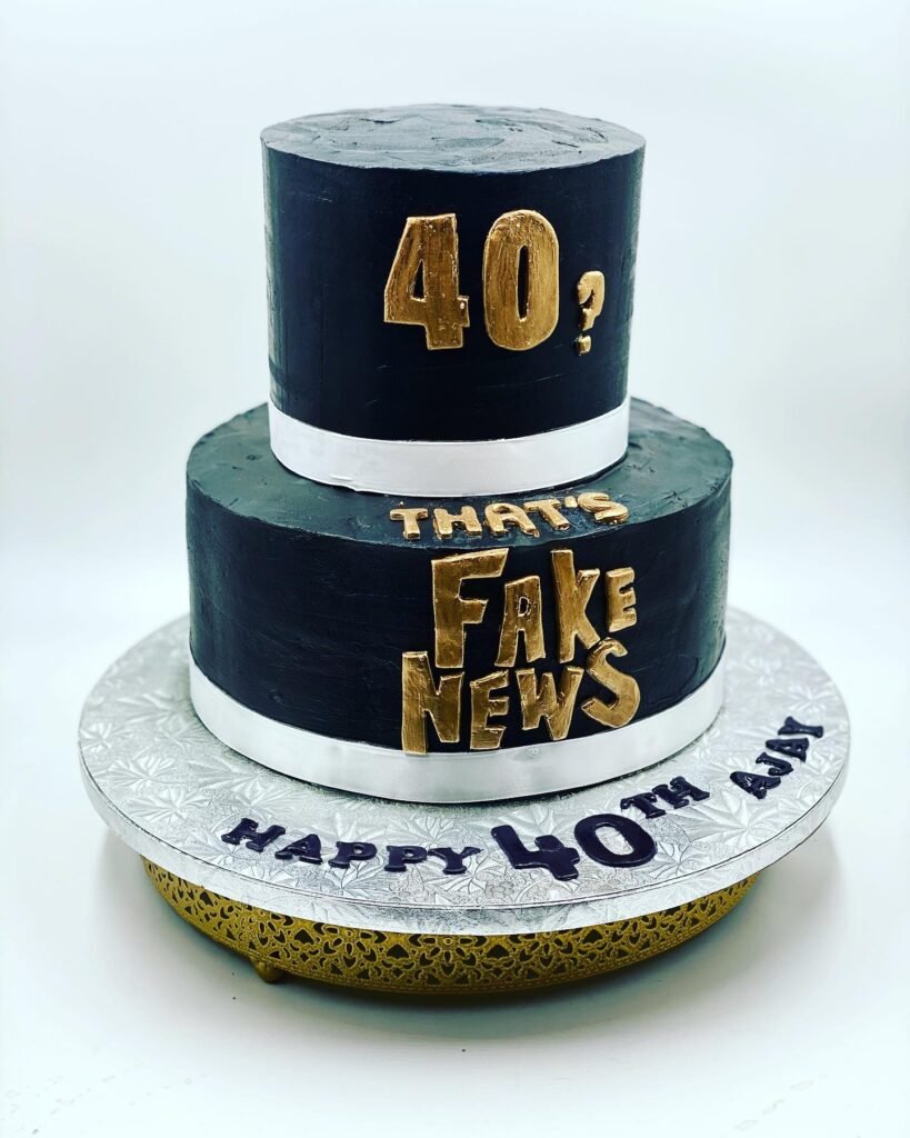 This clever two-tier design features a newspaper aesthetic with “FAKE NEWS” prominently displayed, suggesting that turning forty is just a rumor that shouldn’t be believed.