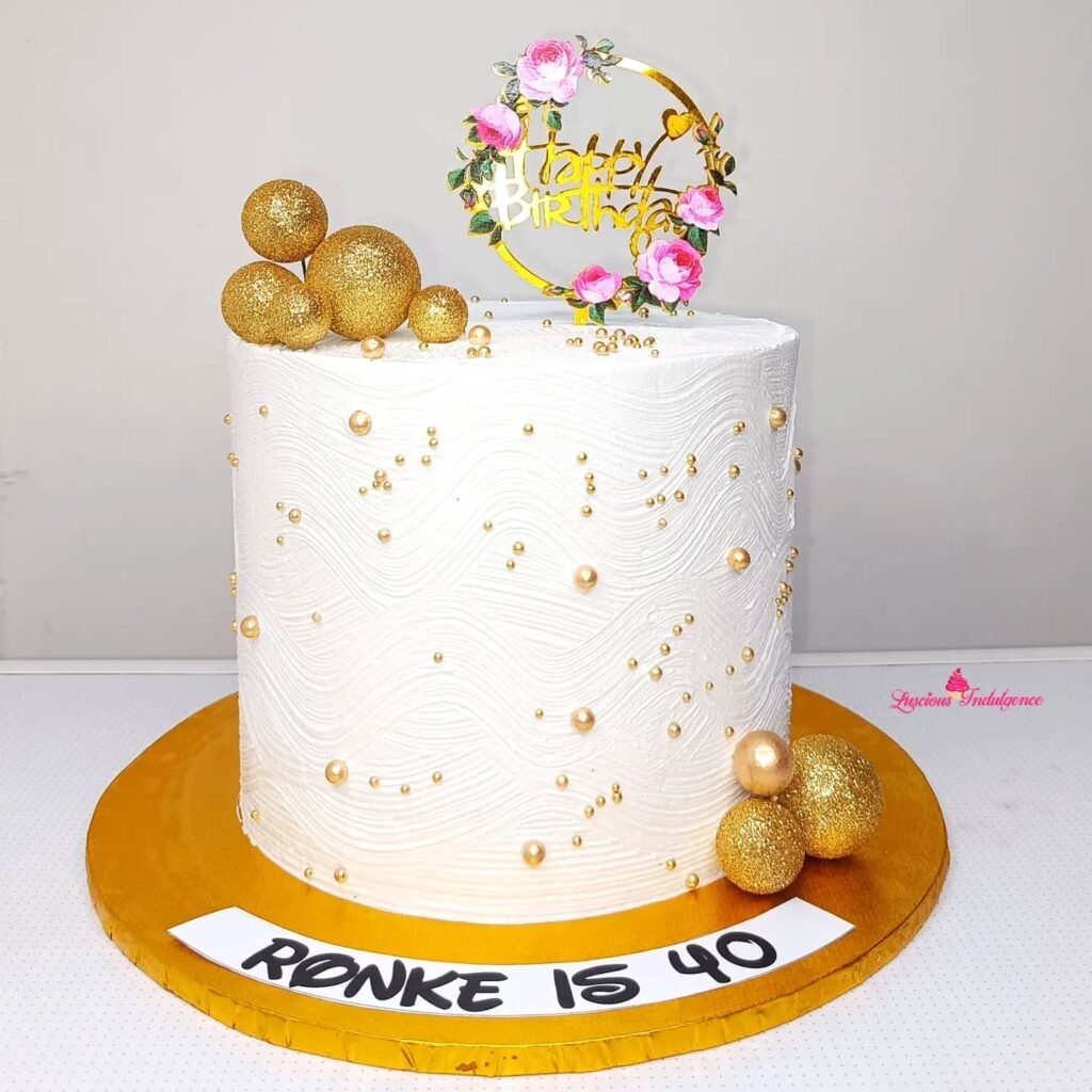 Clean white fondant creates the perfect canvas for subtle geometric texturing that catches the light elegantly. The large gold “40” number topper commands attention without being overwhelming, while decorative elements like golden palm leaves and mixed metallic spheres add contemporary flair.
