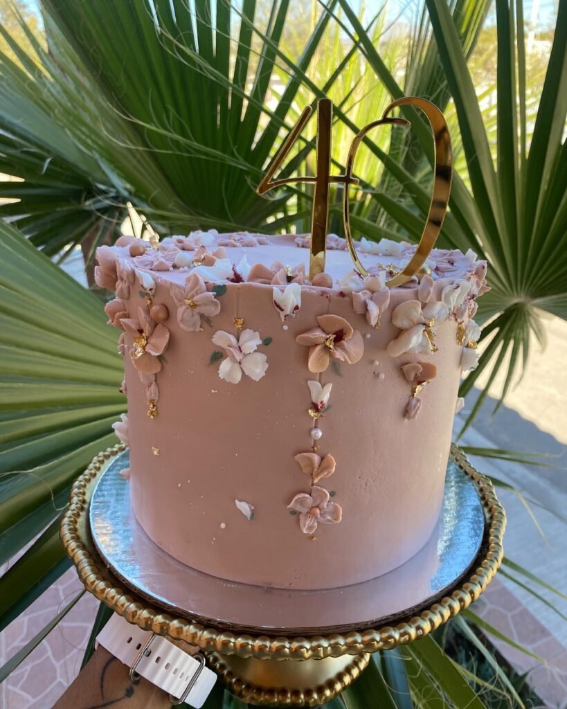 Textured buttercream mimics organic patterns while maintaining clean, modern lines. Dried pampas grass, golden wheat, and delicate florals create an earthy, romantic arrangement that feels effortlessly chic. The simple gold “Hello 40” topper adds just the right amount of celebration without overwhelming the natural aesthetic.
