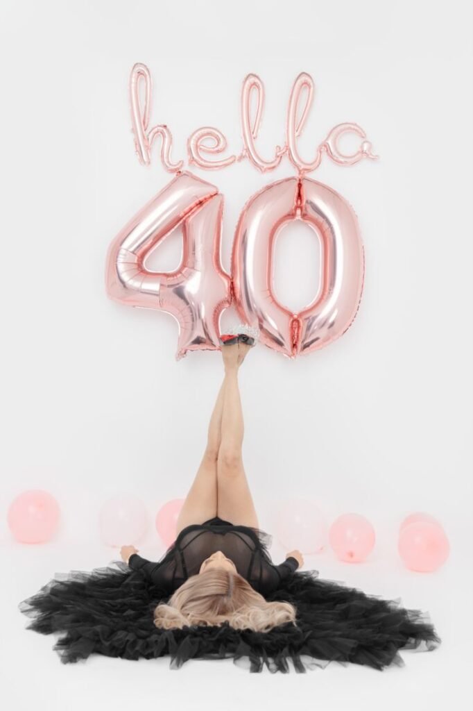 Mark a significant 40th birthday with a fun and memorable photoshoot. This creative setup features large, rose gold “Hello 40” balloons, making a bold statement against a crisp white background. They convey a sense of excitement and welcome to this new chapter.