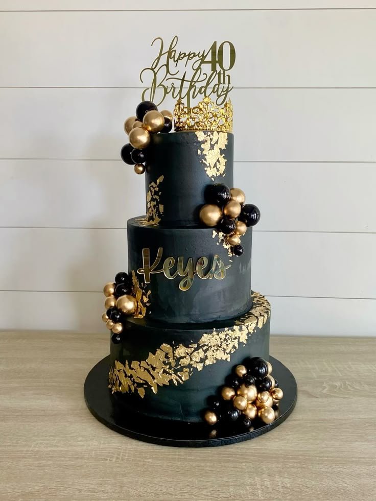 Celebrate a grand 40th birthday with this stunning three-tier cake, exuding luxury and sophistication. Each tier is elegantly coated in a rich, matte black frosting, providing a dramatic canvas for the golden accents. The dark hue adds a touch of modern elegance.