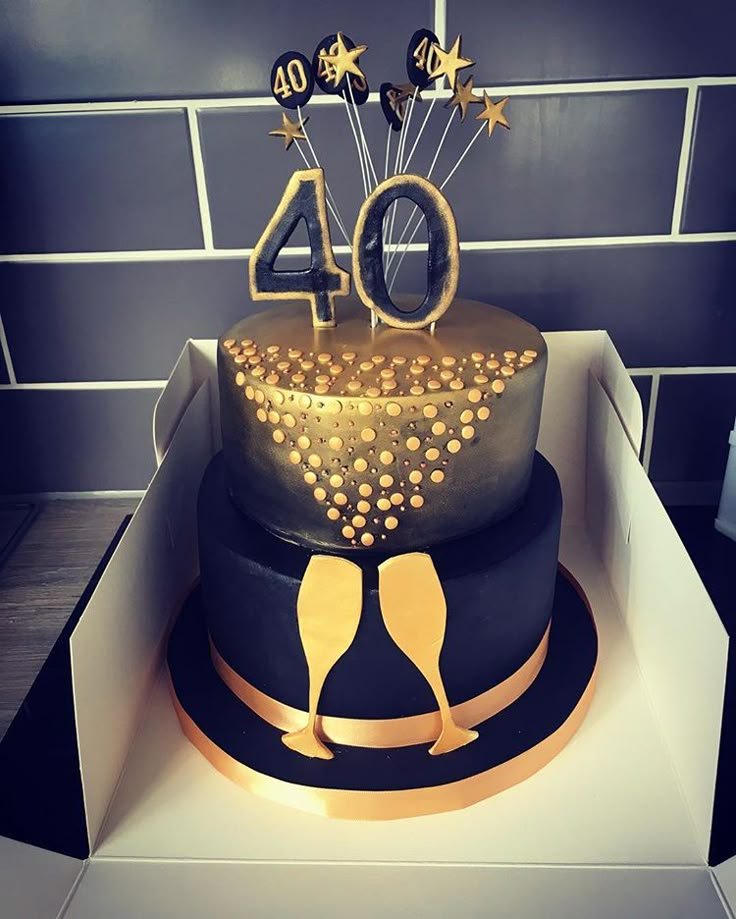 Here are truly sophisticated 40th birthday ideas, exemplified by this exquisite cake. A sleek black fondant cake provides a striking canvas for shimmering gold accents. Delicate golden leaves gracefully cascade down the side, adding a luxurious botanical touch.