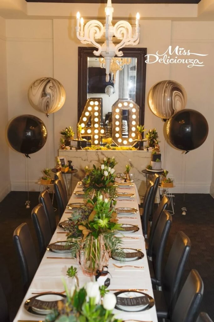 At the room’s focal point, large, illuminated “40” marquee numbers stand proudly on a mantelpiece, reflecting in a grand mirror. These glowing numbers are flanked by stylish black and marbled balloons, enhancing the celebratory atmosphere. This entire setup creates an intimate yet grand setting for a memorable 40th birthday gathering.