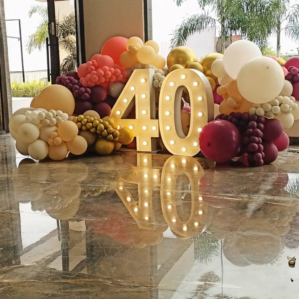 Celebrate a stylish 40th birthday with a grand and sophisticated decorative setup. Large, illuminated “40” marquee numbers shine brightly, marking the special occasion with an elegant glow. These numbers create a prominent and inviting focal point.