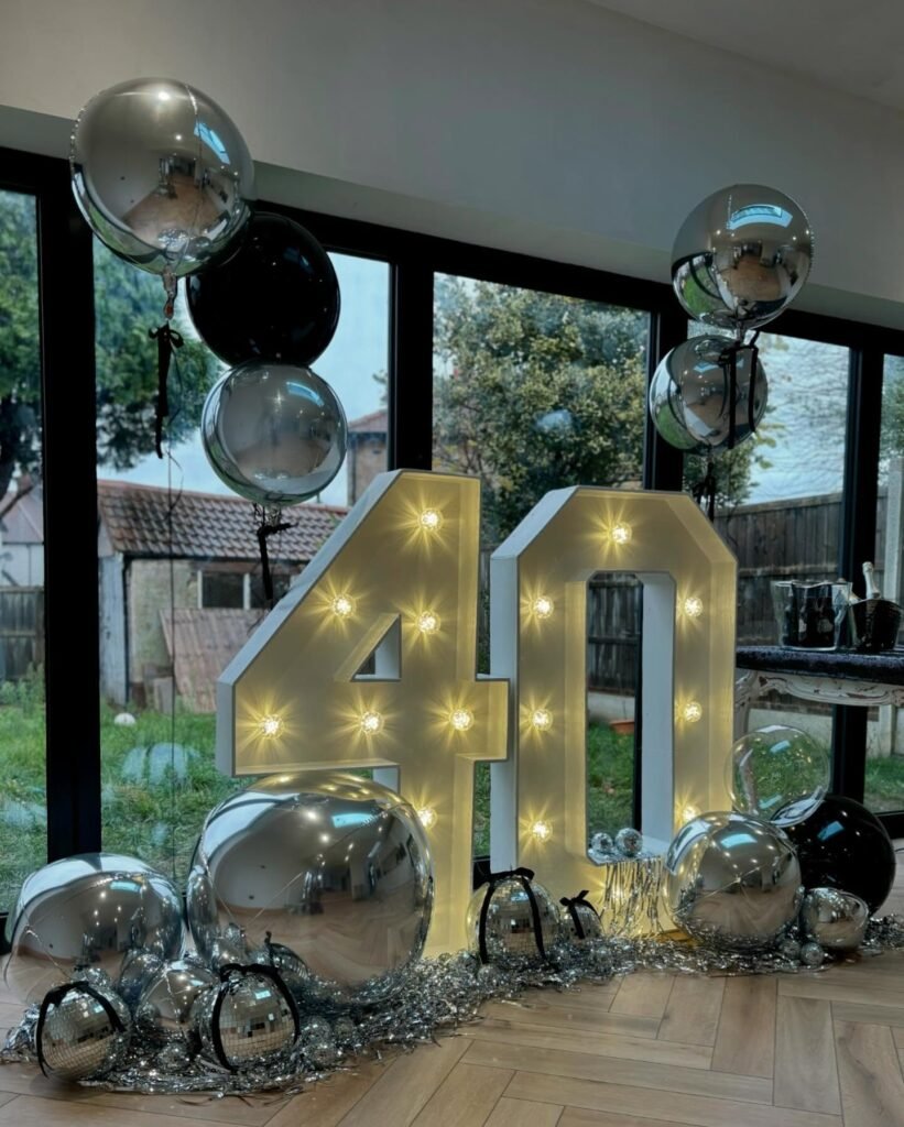 Here are fantastic 40th birthday ideas for a glamorous celebration. Large, illuminated “40” numbers immediately capture attention, setting a festive mood. Surrounding them are an array of dazzling silver and black balloons, some reflecting light like disco balls.