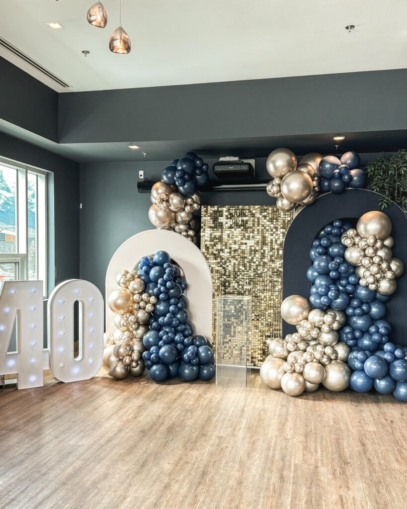 Discover elegant 40th birthday ideas with this captivating blue and silver theme. A striking balloon arch, transitioning from deep blues to soft aquas and shiny silvers, frames a personalized “Happy 40th Birthday” sign. The diverse balloon sizes add dynamic texture to the display.