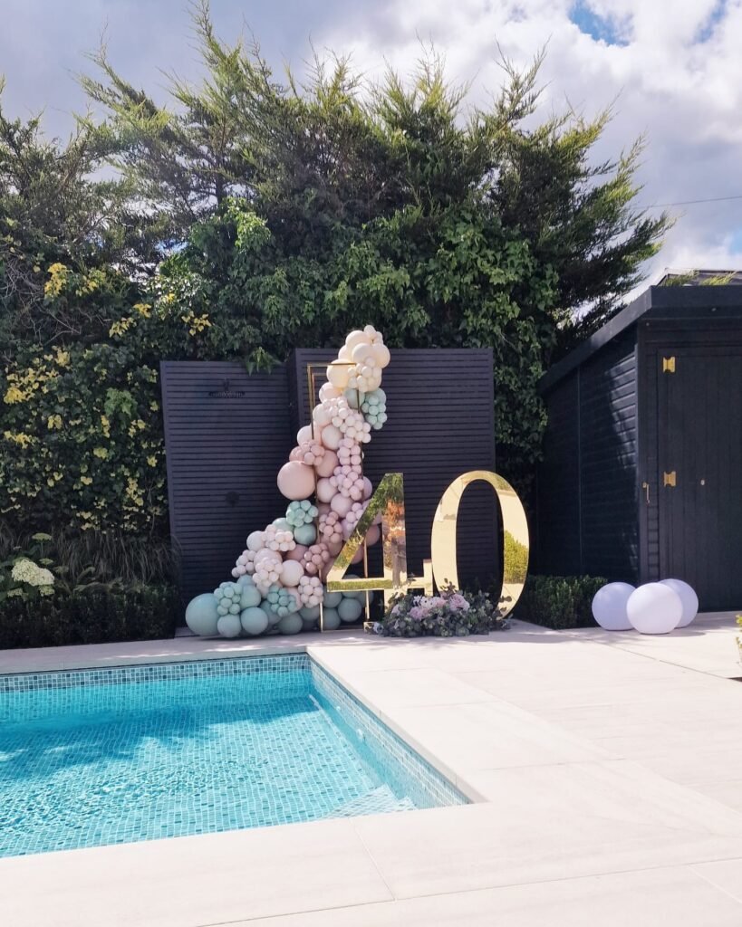 Large, reflective gold “40” numbers stand prominently, adding a luxurious touch to the decor. A small floral arrangement at the base of the numbers enhances the elegance. The sparkling blue water of the pool acts as a refreshing foreground.