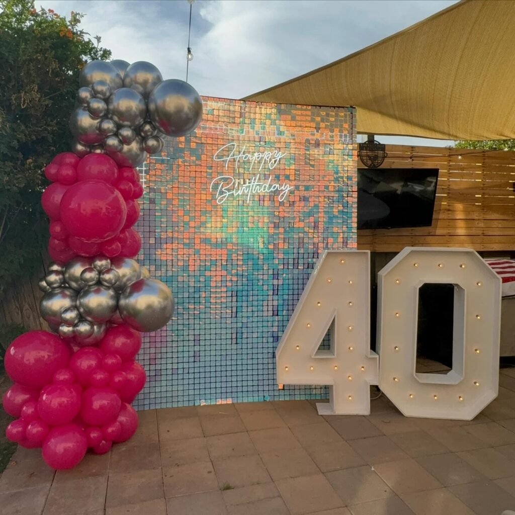 Behind it all, a shimmering sequin wall provides a dynamic backdrop. The reflective surface catches the light, adding sparkle and a modern touch. This combined ensemble truly elevates the party atmosphere, making it an unforgettable 40th birthday celebration for all.