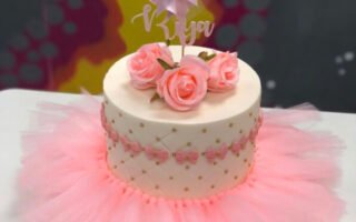 Brilliant sprinkles and edible flowers contribute to the celebratory feel, causing the cake to appear as wonderful as it is. The pale, pastel hue of the frosting and decorations produces a playful, happy look. This cake is a sweet centerpiece for any party.