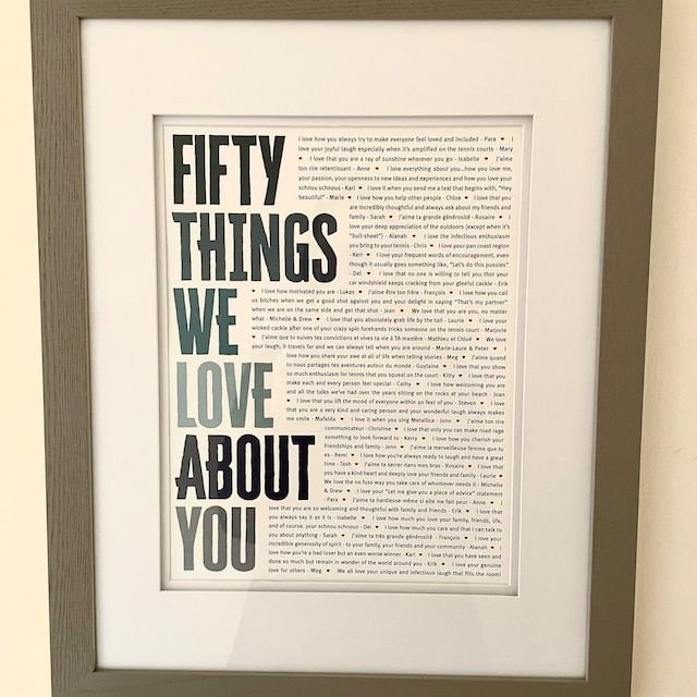 This framed print, titled “Fifty Things We Love About You,” offers an incredibly heartfelt 50th birthday gift idea. It’s a collection of personalized messages, each highlighting a unique quality or memory. This kind of present truly speaks volumes, showing deep appreciation and love for the recipient.