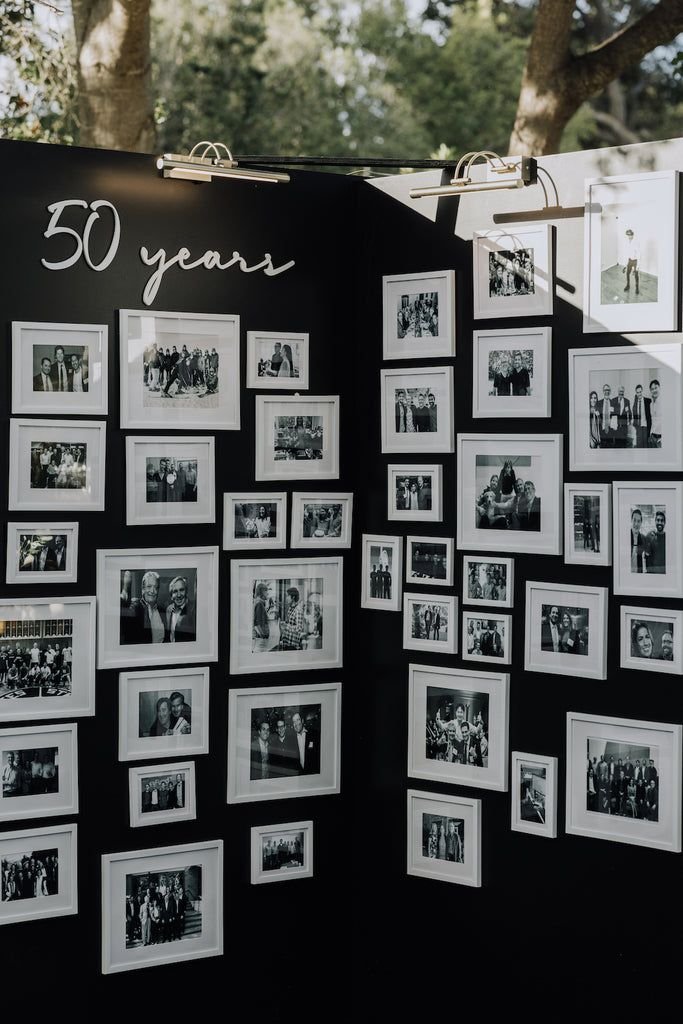 This striking “50 Years” photo wall serves as a deeply meaningful 50th birthday gift idea, transforming memories into a grand visual statement. A collection of framed black and white photographs is artfully arranged on a sleek black backdrop, showcasing five decades of life’s journey. Each picture tells a story, inviting reflection and shared smiles.