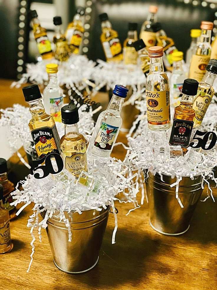 These mini spirit bottle centerpieces offer a spirited and lively 50th birthday gift idea, serving as both decoration and party favors. Each shiny silver bucket is filled with an assortment of miniature liquor bottles, nestled in a bed of white shredded paper. Small “50” picks are playfully interspersed, highlighting the milestone.