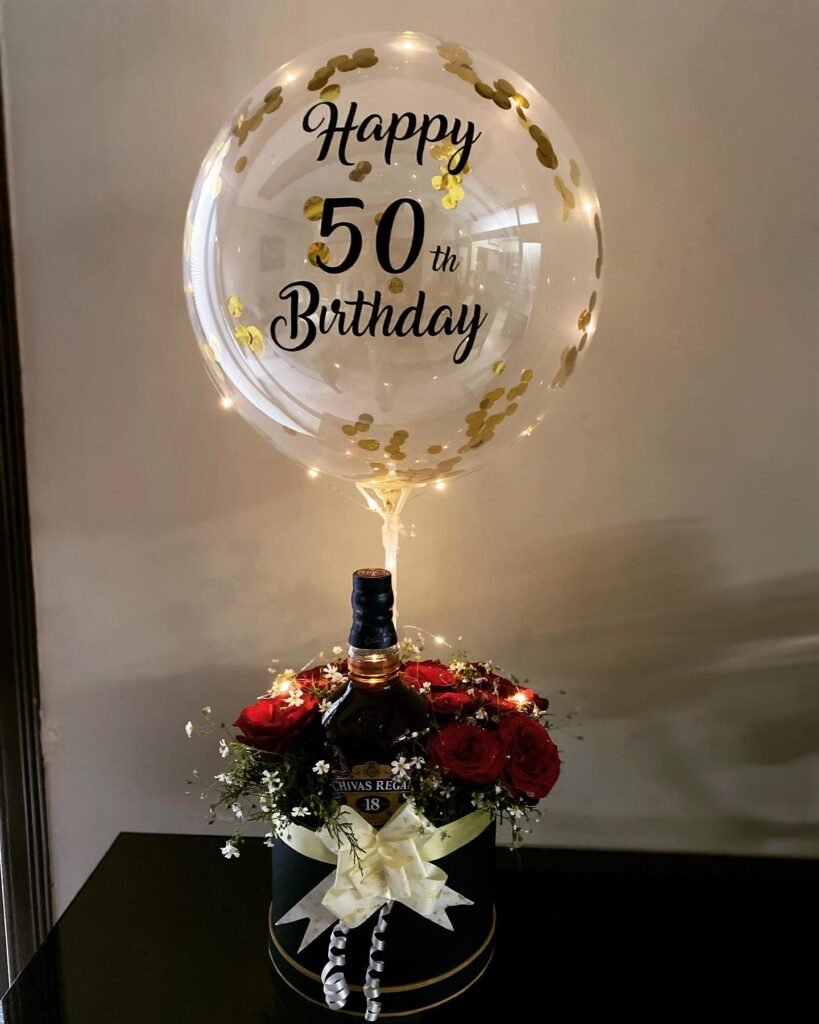 Above this beautiful base floats a clear balloon, inscribed with “Happy 50th Birthday” and filled with golden confetti, creating a truly festive visual. This combination of fine spirits, fresh flowers, and celebratory balloons makes for an unforgettable presentation. It speaks of luxury and thoughtful consideration.