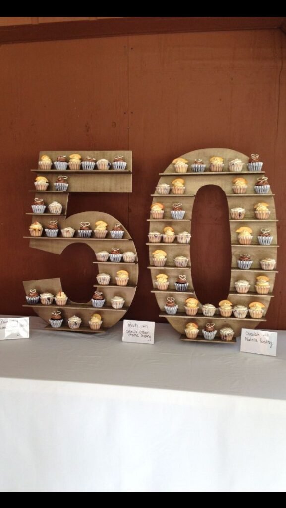 This charming “50” shaped cupcake stand is an incredibly sweet and creative 50th birthday gift idea, perfect for a celebration. Each wooden numeral is designed with multiple shelves, holding an array of delicious mini cupcakes in various flavors. This display serves as both a dessert station and a striking centerpiece.