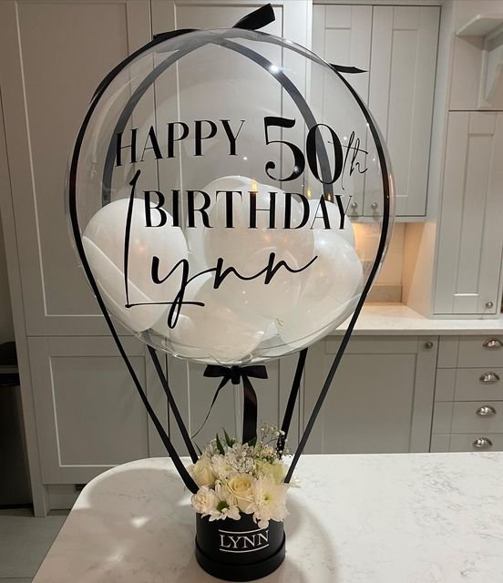 Celebrate a landmark occasion with this delightful balloon bouquet, a truly festive 50th birthday gift idea. Inside a clear, large balloon, smaller white balloons float, creating a whimsical and celebratory atmosphere. “Happy 50th Birthday Lynn” is elegantly inscribed, adding a personalized touch that makes the recipient feel extra special.